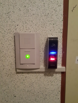 지문인식기 키스위치 기능을 사용하여 무선퇴실버튼 컨트롤 가능, 무선리모컨을 사용하지않을 때를 대비해 안쪽에 퇴실버튼 추가 설치 -